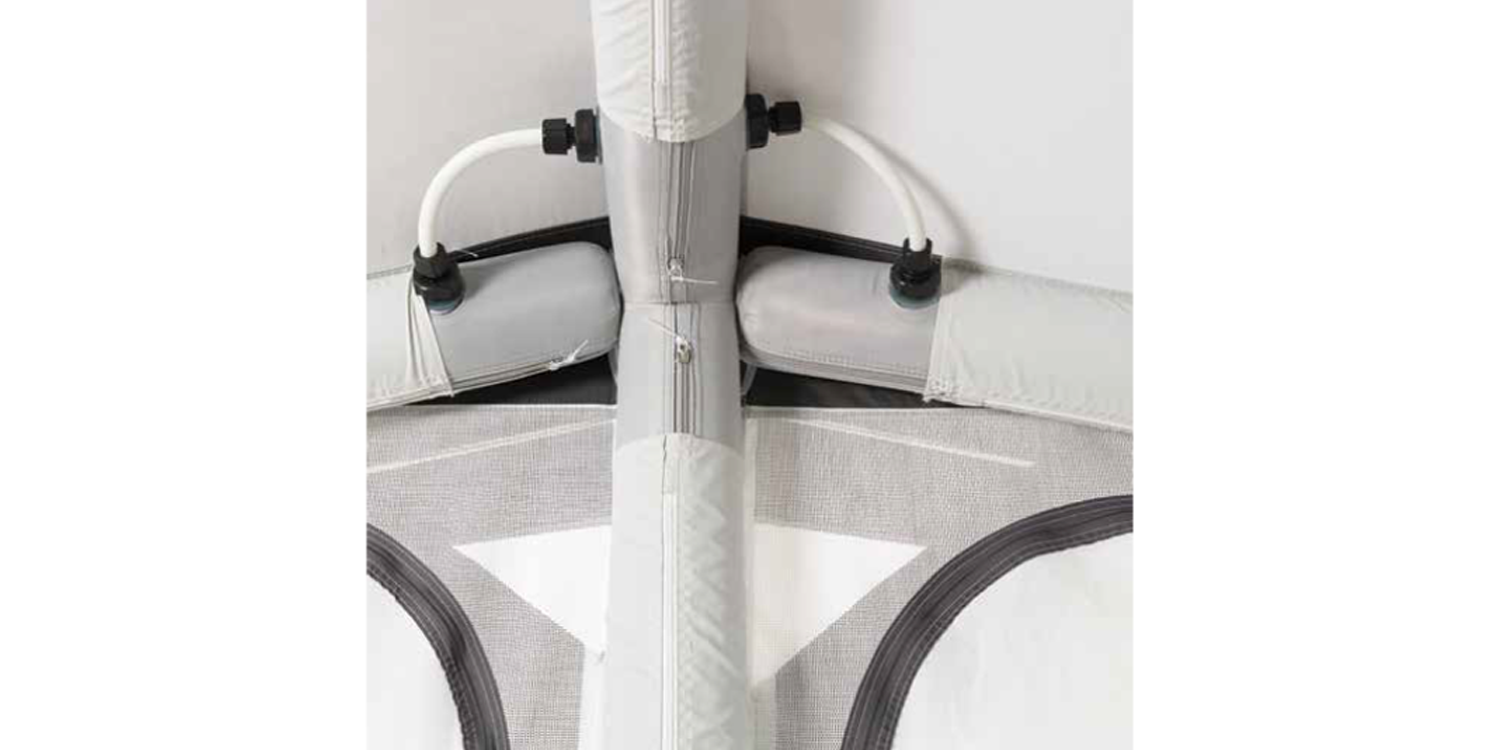 The main Air frame which consists of 3 roof, 3 leg, 3 angles and apex tubes all inflate together from one valve with additional roof and leg supports erected separately on sizes 8 – 19. This allows the frame to be erected in minutes.