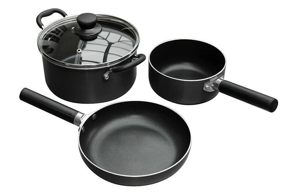 Made from high quality aluminium so the pan set is not too heavy when full. The outer pans have a black anodised coating. The largest pan and the frying pan neatly house the see though toughened glass lid with steam vent holes and a cool touch plastic knob. The pans benefit from a tough non-stick coating and the whole set stacks together neatly to protect this coating. The whole pan set is stored inside a neat and stylish Oxford draw string carry bag.