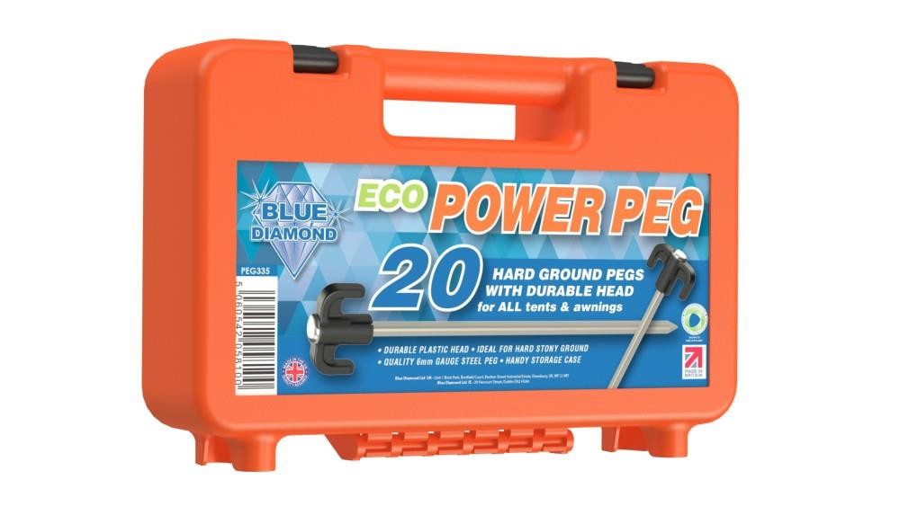 The Blue Diamond Eco Power Peg is a tent & awning peg ideal for hard or stony ground. Manufactured in the UK from quality 6mm gauge steel and plastic which is responsibly sourced from recycled materials for the peg heads. The handy plastic storage case contains 20 Power Pegs.