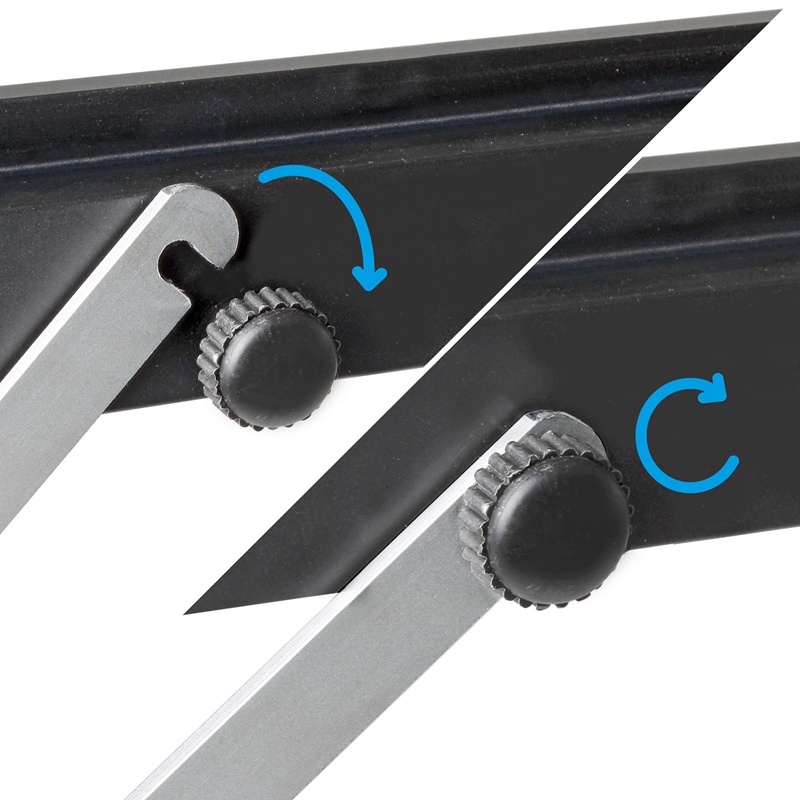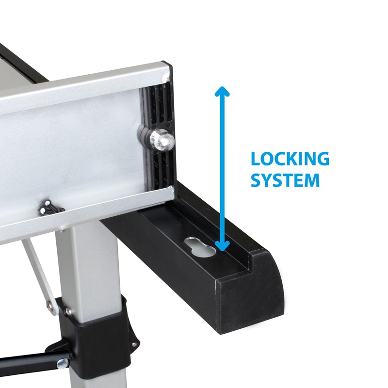 The new Quadra aluminium table range with rollable top features a new totally new folding frame, which is based on the classic table construction with 4 vertical legs. The gapless table top is connected to the table frame with a special quick-locking mechanism. In contrast to the classic folding tables with an x-frame, the Quadra offers enough leg clearance on all 4 sides. Easy and quick setup. Modern design combined with improved functionality. A carry bag for comfortable transport is included.