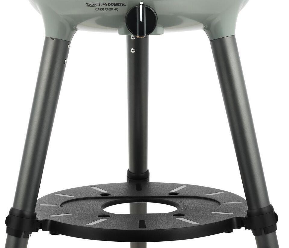 The dome lid, with stay-cool handle and thermometer, hooks onto the side of the BBQ to act as a windshield, and the utility shelf provides safe seating of the Cadac Power Pak gas supply.