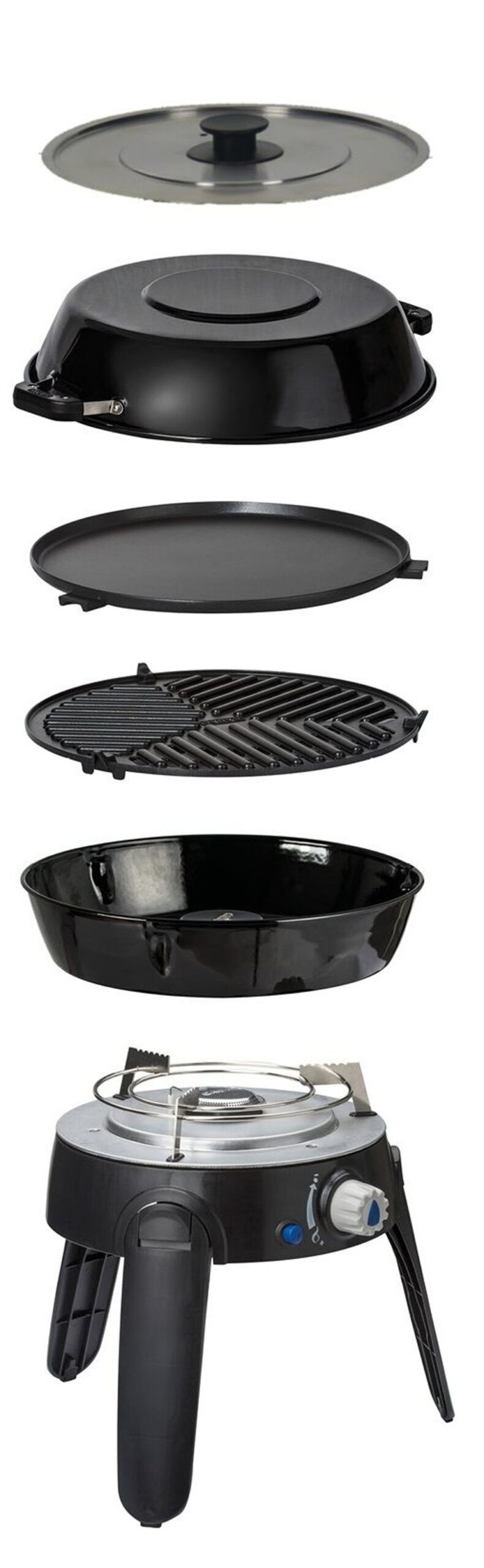 - Four cooking surfaces, BBQ lid that can act as a wok or a pan, a flat ribbed grilling surface, a flat frying surface, a pot stand for boiling