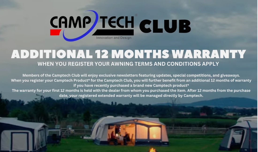 When you register your Camptech Product* for the Camptech Club, you will further benefit from an additional 12 months of warranty if you have recently purchased a brand new Camptech product*