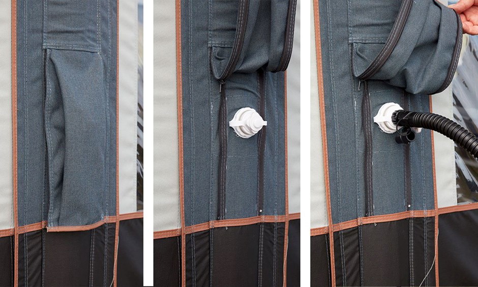 The IsaAir system has just one inflation point for pumping up and is extremely easy to operate. The modular air system, with a valve connection between all modules, allows you to simply isolate an air beam after closing the valve connection to the other modules and replace it without having to take the awning down. The On/Off switch indicates clearly if it is open or closed. The air beams consist of three layers for airtightness and stability.