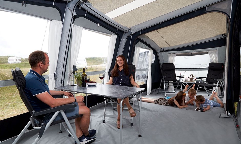 A special detail of Cirrus North is that it comes with no extra poles. The awning consists solely of air beams, so you dont have to put extra poles in the canopy or by the caravan. The canopy protects the awning from the elements while providing pleasant shade.