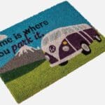 Exclusive quest designed home is where you park it (camper van) mat. A high quality, heavy duty indoor and outdoor mat with an attractive, bright caravan sweet caravan design. The top is a heavy duty coir, perfect for out outdoors as well as in and has a non slip heavy duty P.V.C. backing. This mat is 36 x 50 cm in size and only weighs 0.9 kg. It looks great not only in the motor home or camper van, but in a house, garage, shed or any indoor or outdoor location.