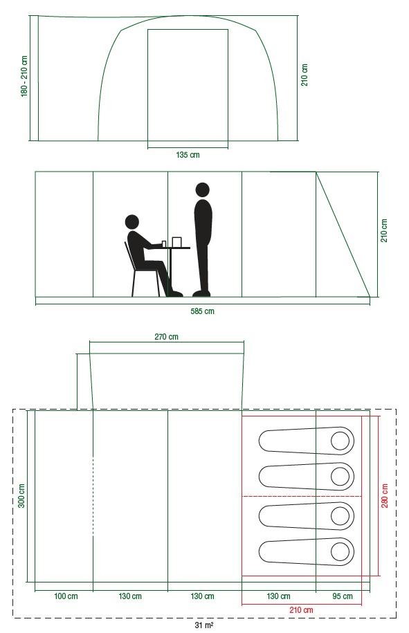 - Dimensions (L x W x H): 585 x 3000 x 210cm plus connecting tunnel: 100cm