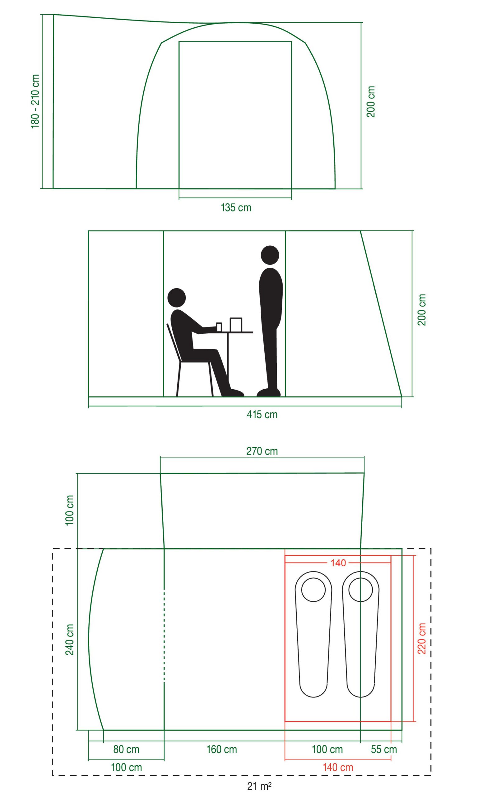 - Dimensions (L x W x H): 415x 240 x 200cm plus connecting tunnel: 100cm