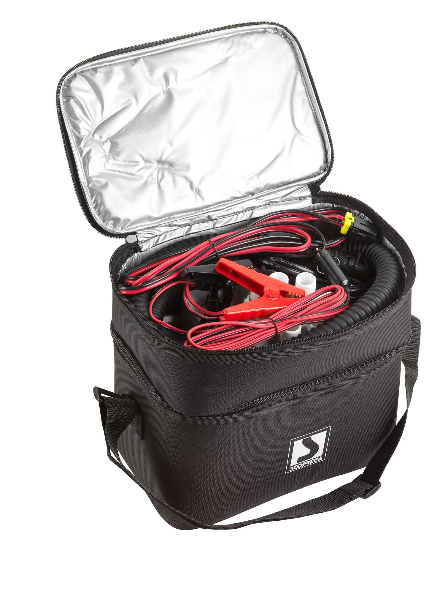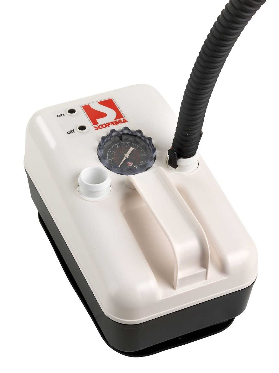 High performance, rechargeable electric air pump with Integrated 12V DC battery and standard 110-240 AC DC adaptor.