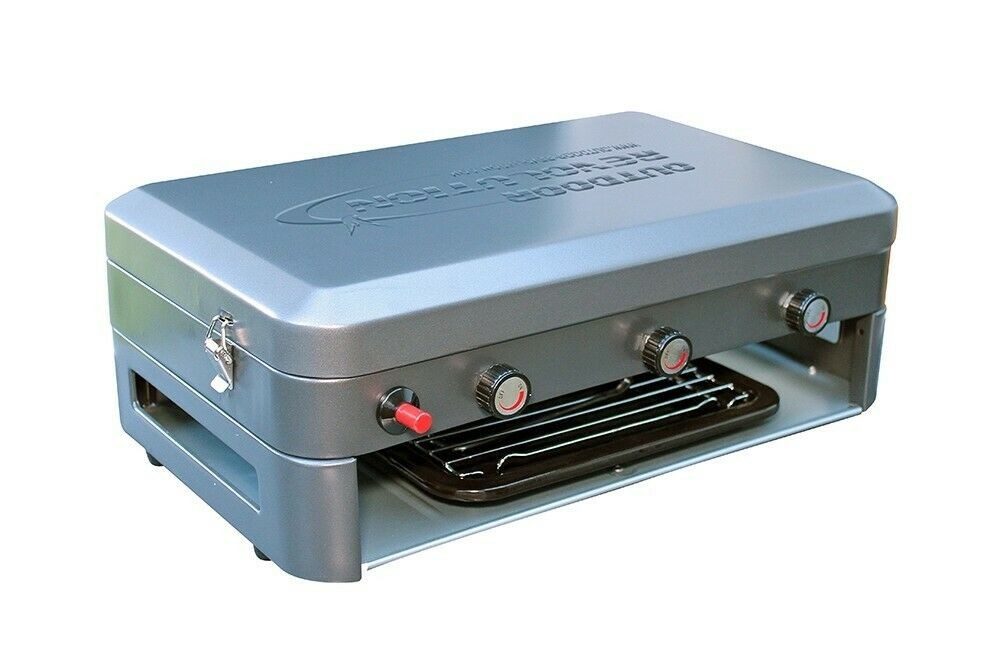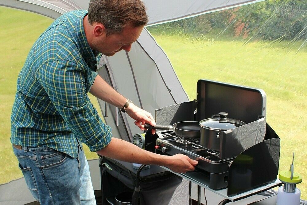 The Twin Burner Gas Stove and Grill is constructed from powder coated steel. It has 2 stainless steel high power 3 kW burners and a 1.4 Kw grill. Comes with a screw on- detachable braided hose with a solid brass control valve. Surrounding the burners is a pressed stainless-steel hob and there is an enamel grill pan with a datable handle. The stove comes with a hinged windshield on both sides that hooks and clips into the lid for extra stability giving a better cooking performance. The windsheilds fold down onto the hob and the lid can be locked into position for easy transportation.