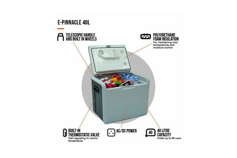 The Vango E-Pinnacle 40 Litre Electric Coolbox can be powered either from AC -230V mains or by a DC – 12V in-car socket. This thermoelectric coolbox is able to cool up to 16°C below the ambient temperature ensuring that your food and drink supplies are kept cool even on a warm day. Telescopic handle and sturdy wheels make it easy to manoeuvre. Two removable dividers for food and beverage storage makes it the perfect coolbox for all occasions.