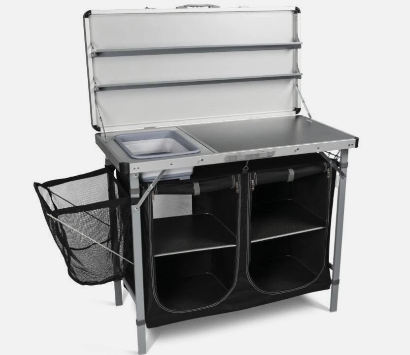 The unit also includes a large hanging larder and waste bins. Folds flat for easy transporting and storage.