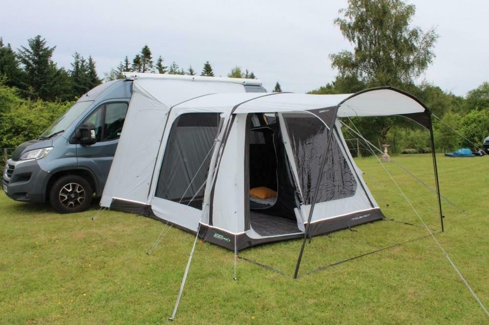 The Movelite Canopy is pitched simply using a robust steel pole, there is a heavy-duty zip to attach the canopy to the awning along with a weatherproof baffle. Storm straps hold the tension & secure the canopy in position while a ground webbing system keeps the pole standing as it should.