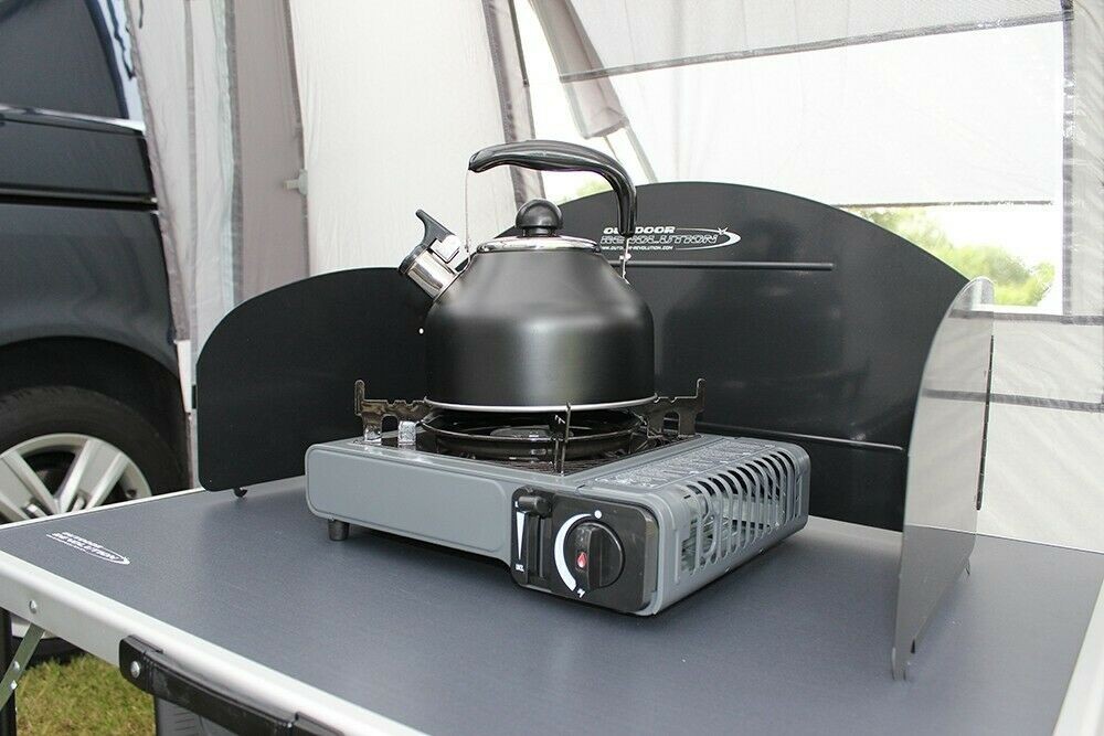 The Universal Windshield is a universal fitting cooker windshield suitable for camping cookers up to double burner width. The sheet steel windshield is supplied with attachable suckers to secure the windshield to a suitable a variety of tabletop surfaces whilst in use. The compact hinged design folds flat for storage.