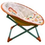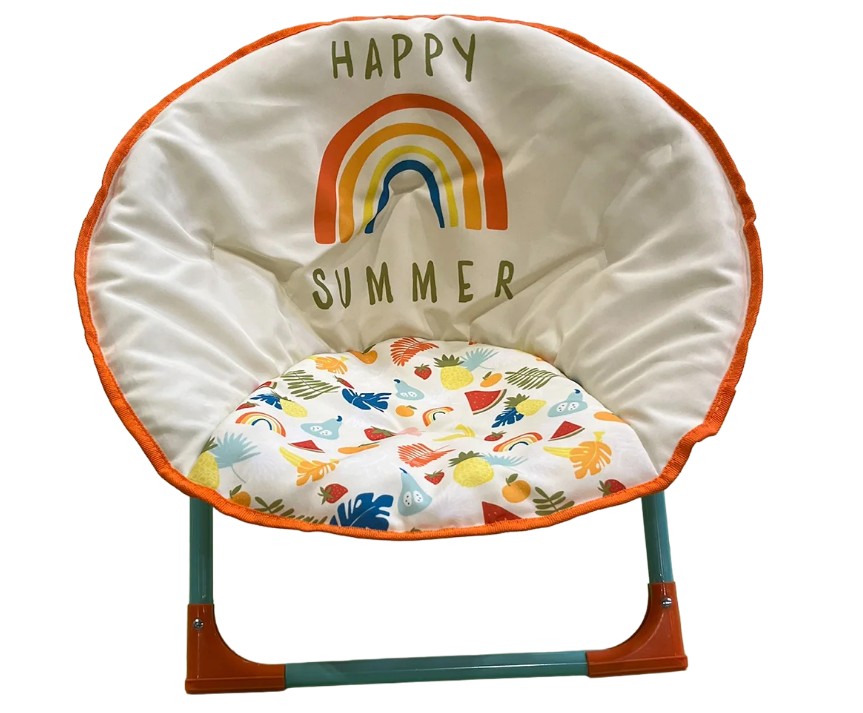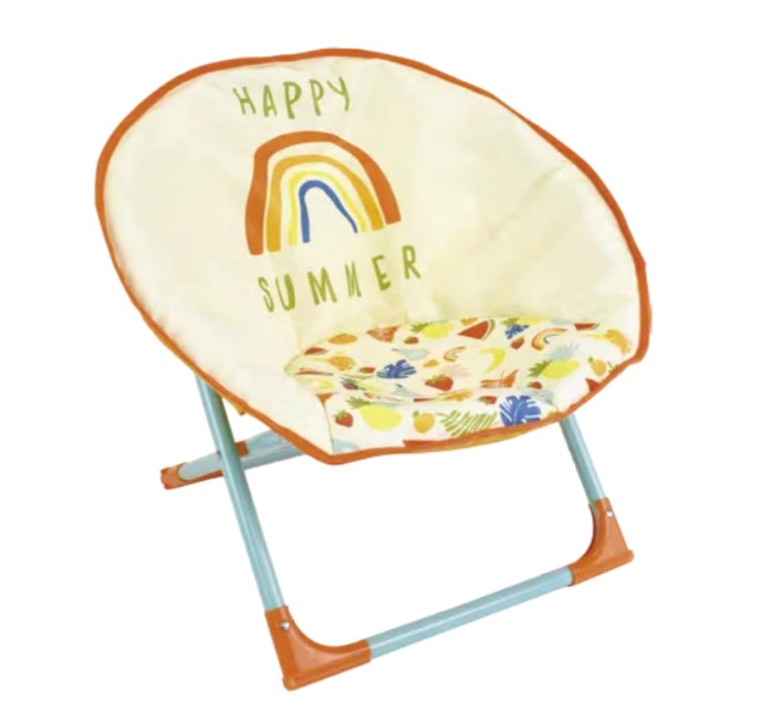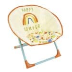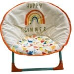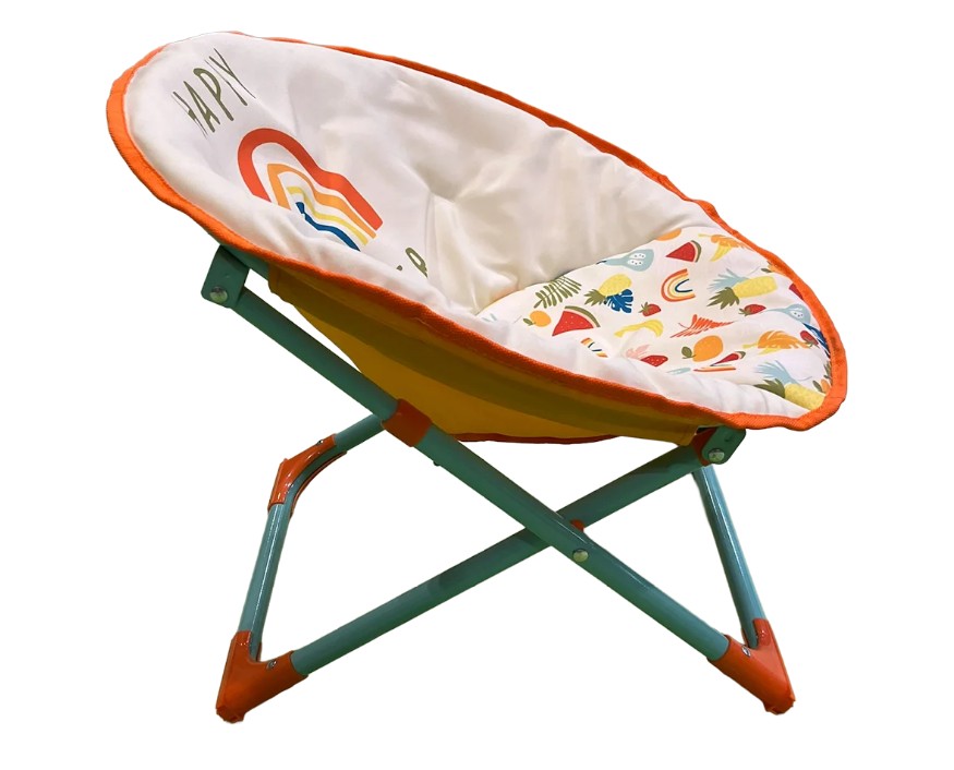 A small childrens sized moon chair. Featuring the pink unicorn design and sporting a pink powder coated steel frame The frame folds in and out in seconds and has a built in safety lock to ensure its locked in position. Great fun for children