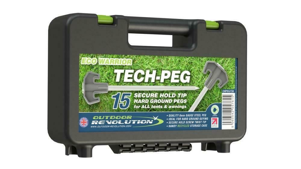 The Outdoor Revolution Eco Warrior Tech Peg is a secure hold tent & awning peg with a twisted tip ideal for inserting and holding strong in hard ground. Manufactured in the UK from quality 6mm gauge steel and plastic which is responsibly sourced from recycled materials for the peg heads and the plastic storage case. The handy storage case contains 15 Tech-Pegs.
