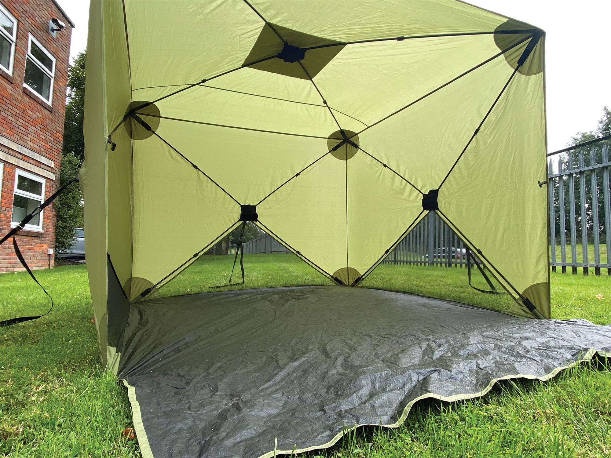There is nothing to build, put together, tension or inflate, you simply take it out of the bag, unfold it and pull/push the sides and roof and it springs into position – fully set up and ready to peg.