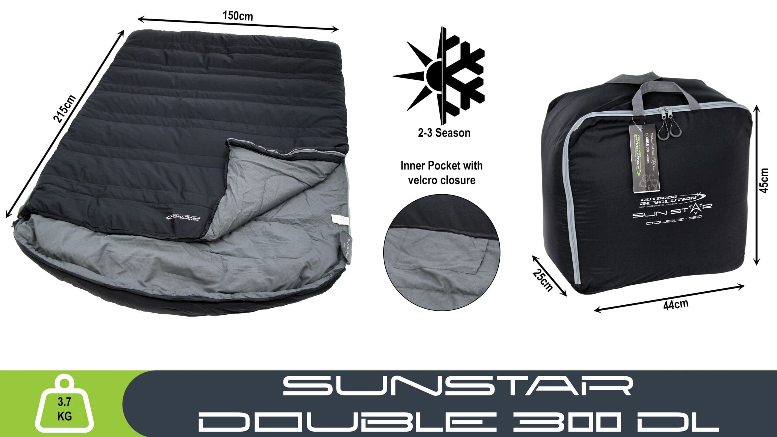 The Outdoor Revolution Sun Star Double 300 sleeping bag is a heavier, 3 season weight double square sleeping bag with a cowl hood, and is perfectly suited for comfortable family camping in the UK and Europe from early Spring through to Mid-Autumn. This bag comes in both left and right-hand side zips which allow each user to exit the bag without disturbing the other. There is also a third zip at the base which allows extra ventilation around the foot area on those hot nights under canvas. The outer shell fabric feels soft and warm thanks to the micro polyester and the lining is also warm to touch thanks to the brushed embossed 190T polyester. All round the Sun Star Double 300 is an excellent heavier weight mid level sleeping bag that has not compromised on quality or features and will give the users many years of comfort and pleasure.