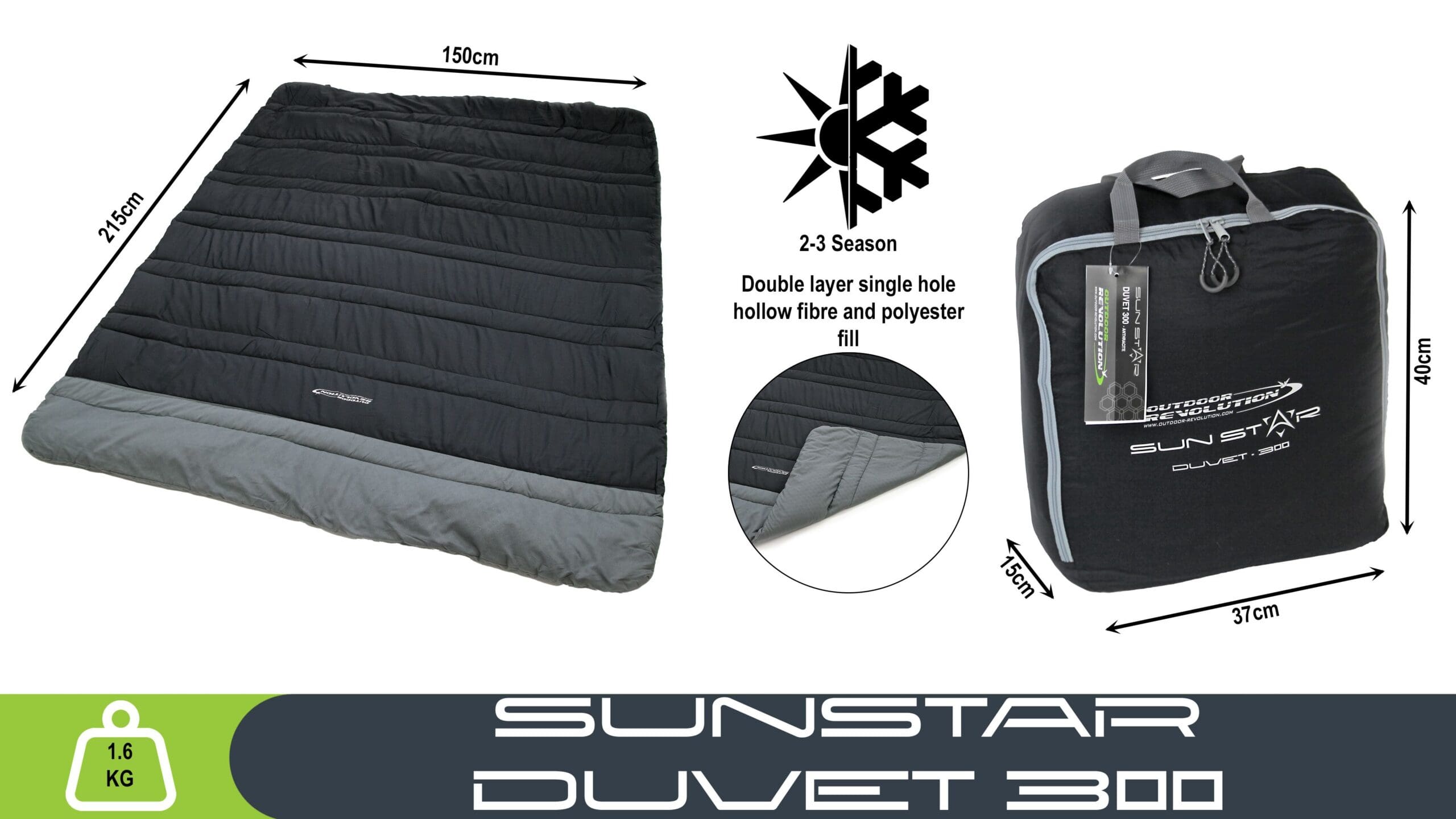 The Outdoor Revolution Sun Star Duvet 300 is an alternative to a sleeping bag, if the user chooses to use it with a flat sheet within a campervan, motorhome or caravan on a warmer night. Still made from the warm and soft touch 190T micro polyester outer fabric with the brushed embossed 190T polyester lining to compliment the rest of the Sun Star range. The Sun Star Duvet 300 can also be used as a wrap around blanket on those often-chilly evenings thanks to the double layer of filling and generous double size (unless your lovable pet dog has already secured it for their bed!). It packs down small and can be used as an emergency car blanket all year round.