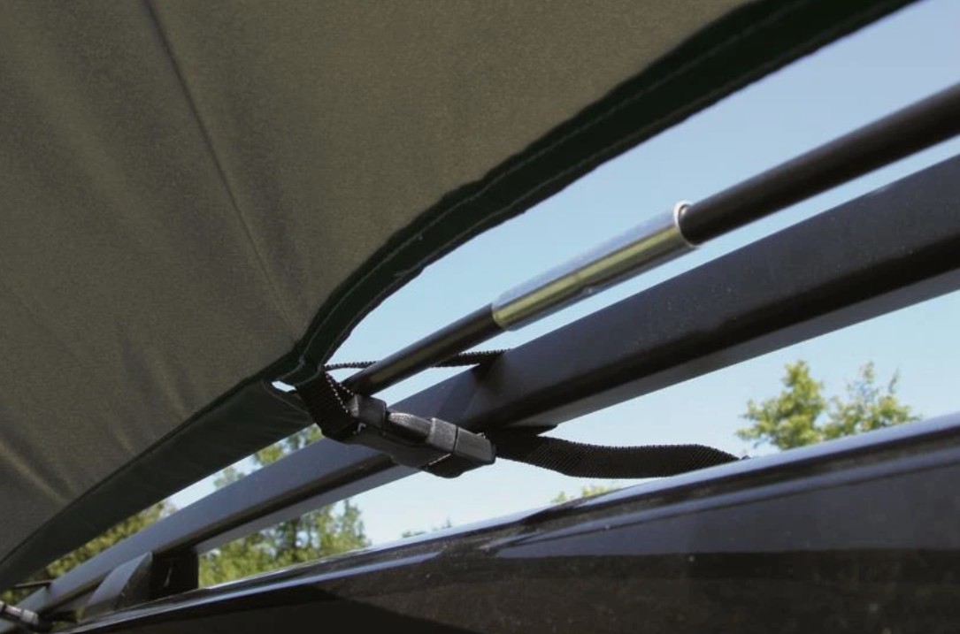 Sunshade especially for use on the roof rails of the car. The tarp can be attached to the roof railing, and if there is no roof rails fitted you can use the supplied suction cups. They can be placed on the roof and the tarp can be attached to it.The tarp Carside comes in the color Safari / Navy, including mounting straps for the car, 2 suction cups and 2 canopy poles.