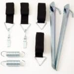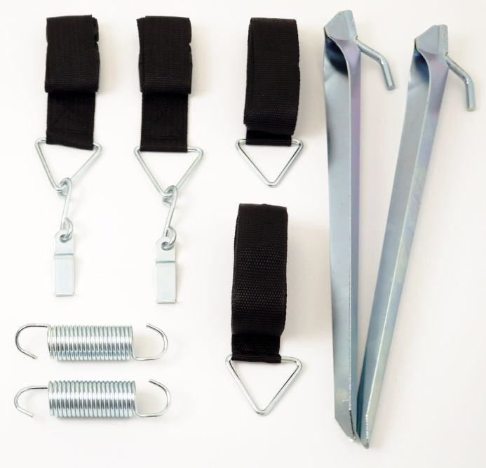 The Outdoor Revolution Tie Down Set is designed to secure your caravan awning in stormy weather. Comprising of 2 x 38cm storm anchor pegs, 2 x 3m + 2 x 66cm nylon webbing straps, 2 x 10cm shock absorbing springs to protect the system and your awning from sudden gusts of wind.