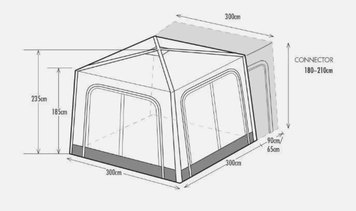 Thanks to the dimensions of 300 x 300 cm and a gable height of 235 cm, there is a very pleasant feeling of space and the tent offers sufficient standing height. A groundsheet is included and ensures that the tent stays clean. All four side walls can be removed if necessary. This turns the air tent into a practical pavilion in no time at all.