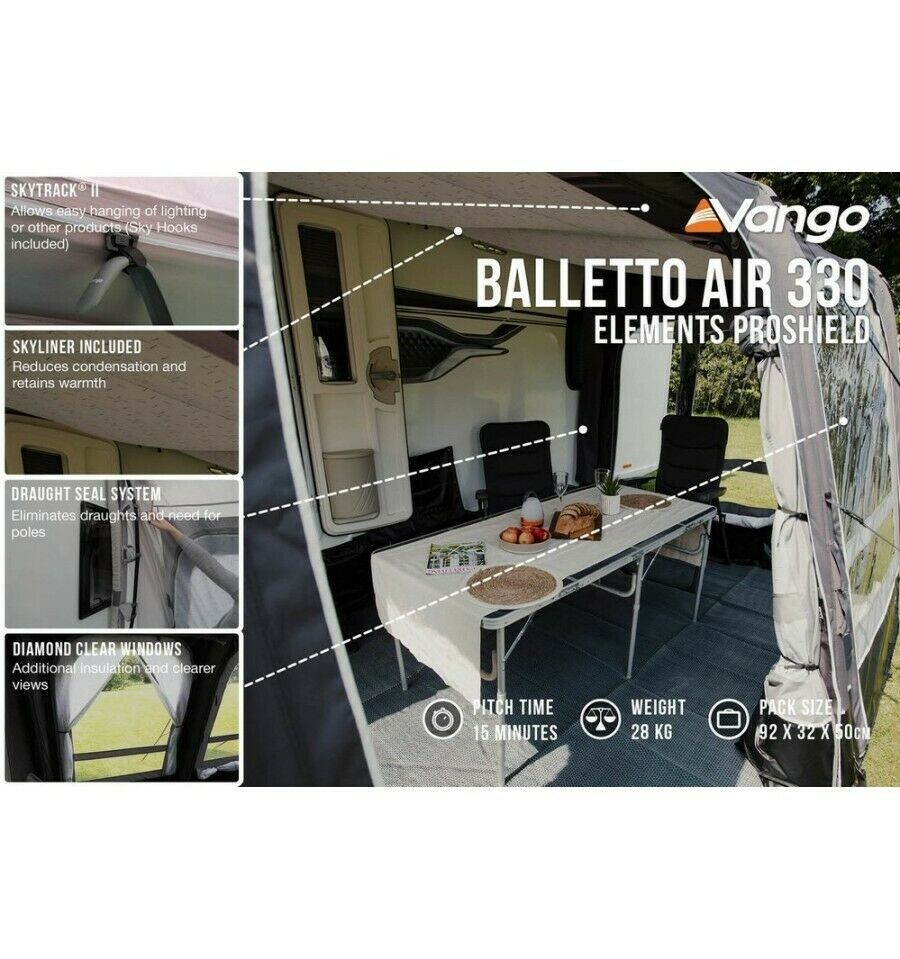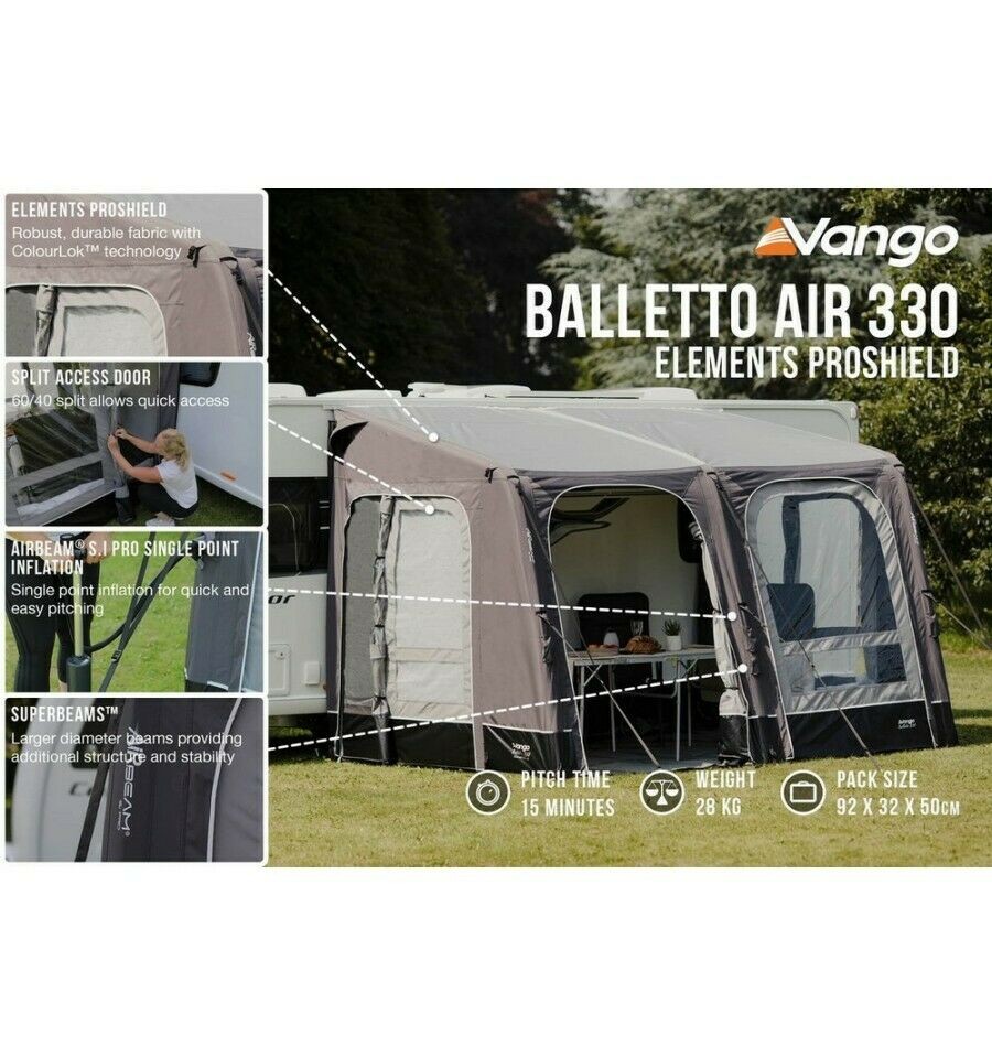 The perfect setting for unwinding on the campsite. The Balletto Air 330 featuring Vango’s revolutionary AirBeam® Single Point Inflation and Multi-Point Deflation makes for a brilliantly quick pitch and pack up, leaving you with more time to enjoy your time away. Take in all-round views and enjoy the outdoors from the comfort of your awning with the large Diamond Clear Windows or adjust the zipped curtains for added privacy. Created with new Elements ProShield fabric, a weather resistant and highly durable fabric with the added benefit of ColourLok™ technology to aid colour retention from UV light. From a handy storage and extra bedroom space to family meals and relaxing, the Balletto Air 330 does it all.