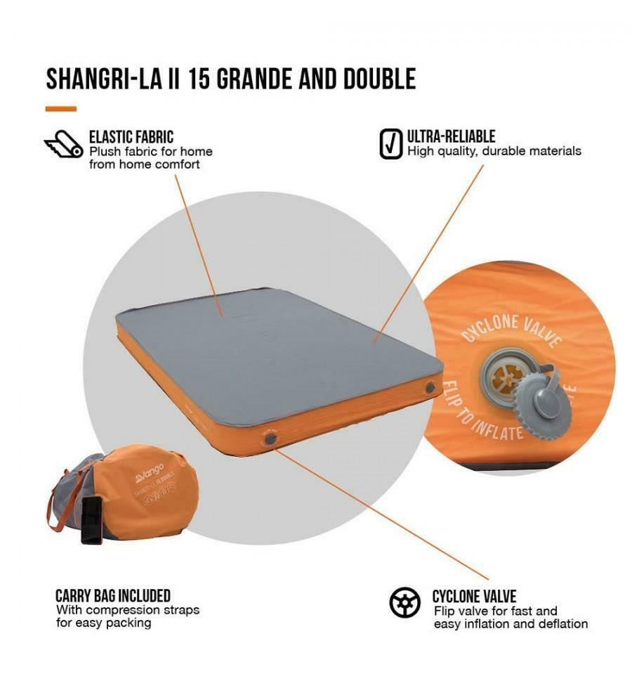 The Shangri-La II 15 Double is, as the name suggests, the pinnacle of Vango’s self-inflating mat collection. It features our unique core cutting construction to create a smaller pack size without compromising on the incredible comfort and a newly designed carry bag for easy packing and transportation. The vertical walls of the mattress provide a flat and level top to the bed and super-soft stretch fabric ensures a plush sleep surface making the Shangri-La the ultimate in camping mattress technology.
