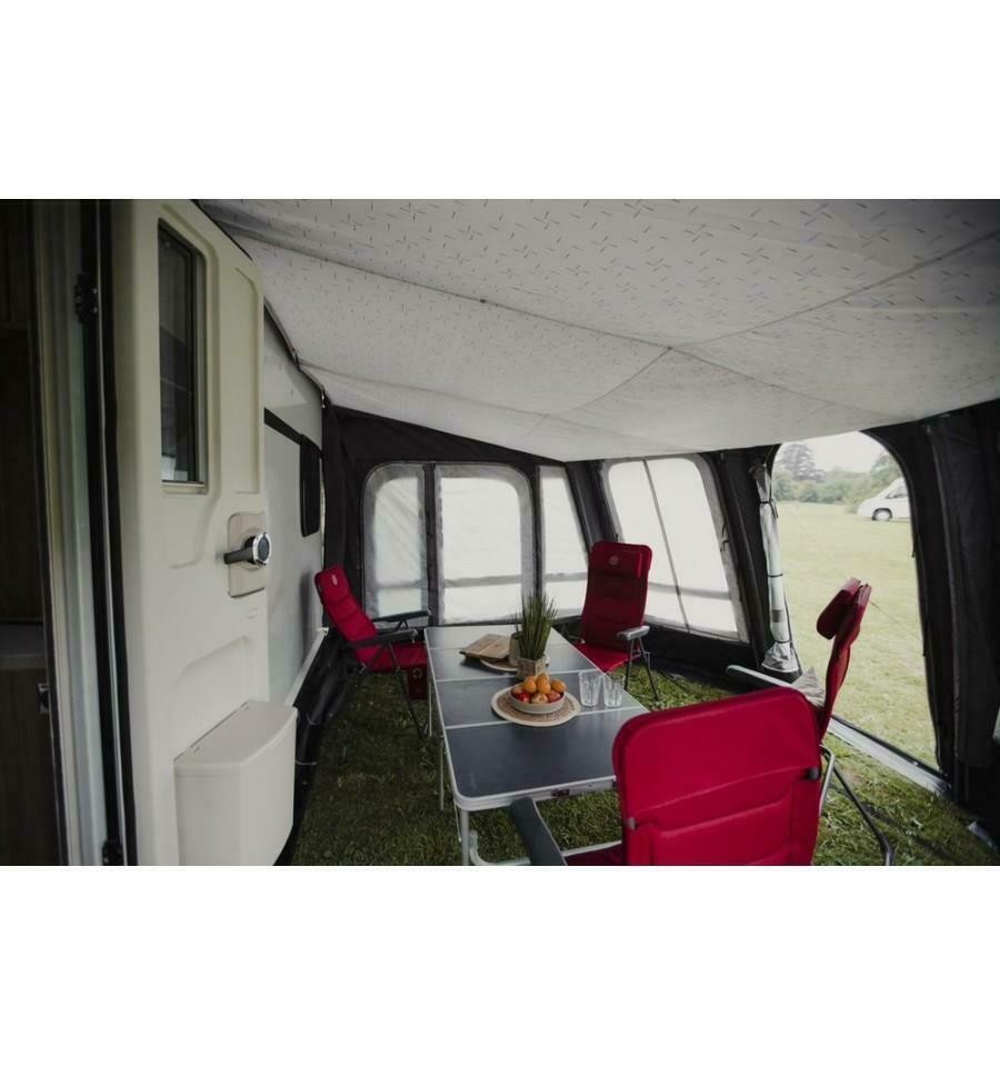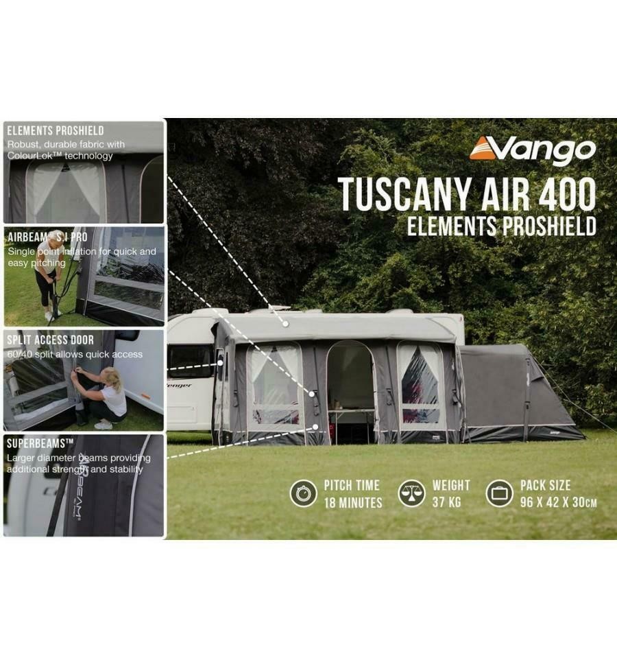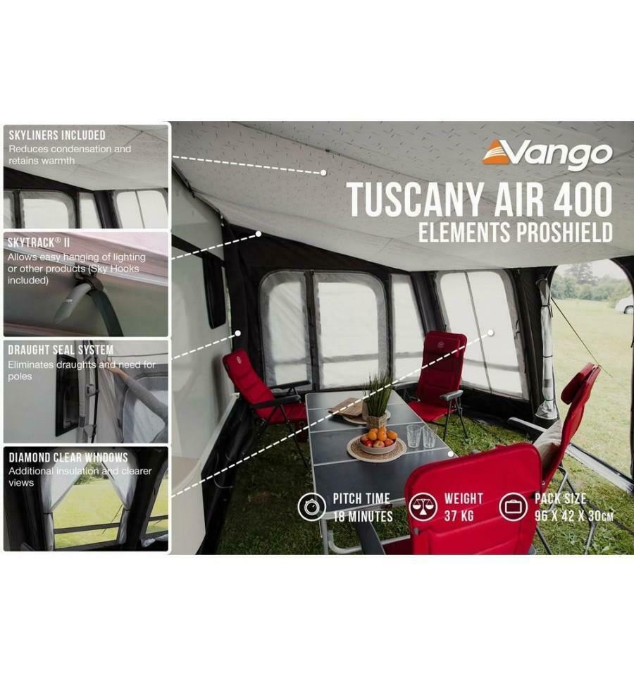 A stylish, unique design with no detail spared, the Tuscany Air 400 is the ideal space to bring all the family together on breaks away. Featuring Vango’s revolutionary AirBeam® S.I Pro single point inflation and Multi-Point Deflation, ensuring even large awnings can be pitched with ease and in just a few minutes. Constructed with new Elements ProShield, a robust fabric with the added benefit of ColourLok™ technology to aid colour retention. The Tuscany also benefits from Vango’s unique Draught Seal System, creating a tight seal between the awning and caravan without the need for poles on breezy days. Enjoy expansive views with the large Diamond Pro windows and multi-zip privacy curtains, guaranteeing a light and bright awning. Sit back, relax and take in the views from the Vango Tuscany Air awning.