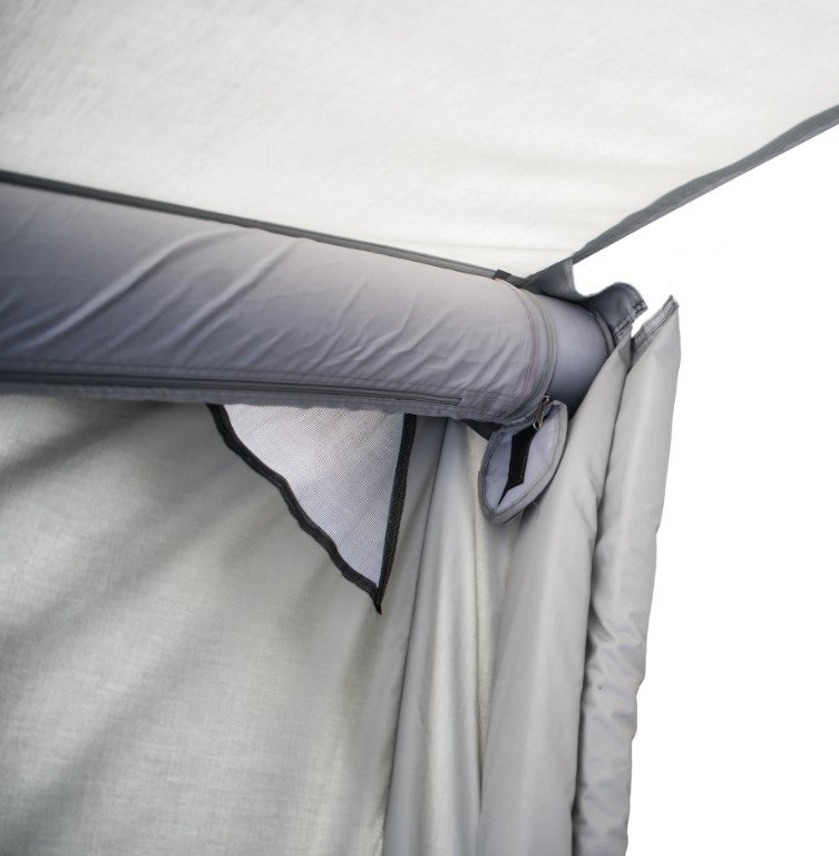 This awning features adjustable air beams. These air beams can also be extended at the top of the beam. This allows them to extend underneath a roll out canopy to fill the gap created when you attach this awning to a roll out canopy. The beam extends underneath the casing of the roll out canopy and sits against the side of your vehicle ensuring a tight and strong fit against your vehicle. The adjustment also helps them to work better on uneven ground by helping to avoid twists and bends in the beams and leads to better rain performance.