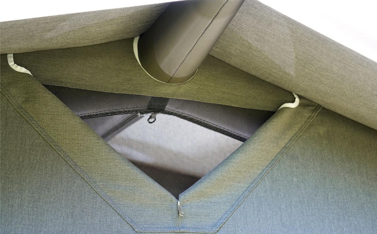 For flexibility, the front and side panels can be fully unzipped to transform the Aura into a wide sun canopy, or rolled aside for extra doorways and airflow. A veranda function (with pole included) allows part of the front to be opened while maintaining shade and ventilation.
